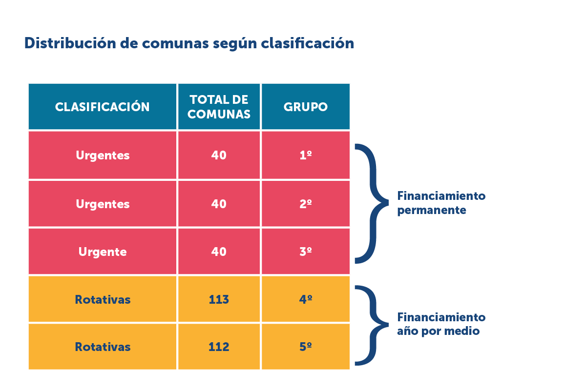 A partir del Índice de Vulnerabilidad Sociodelictual se han clasificado a las comunas en dos categorías: urgentes y rotativas. Las primeras recibirán financiamiento permanente, todos los años, mientras que las segundas recibirán recursos año por medio.